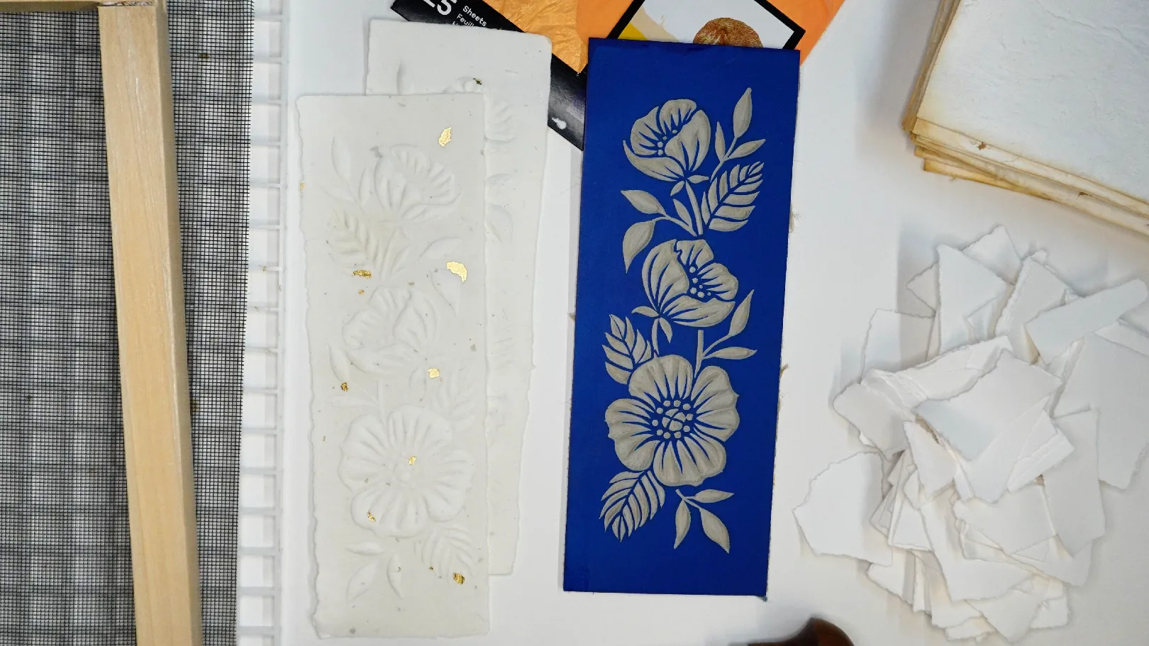 Detailed template on the step-by-step process of creating beautiful handmade paper using recycled paper, followed by instructions on how to craft a unique embossed bookmark from the handmade paper you made.